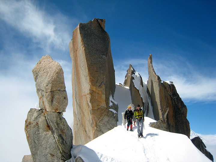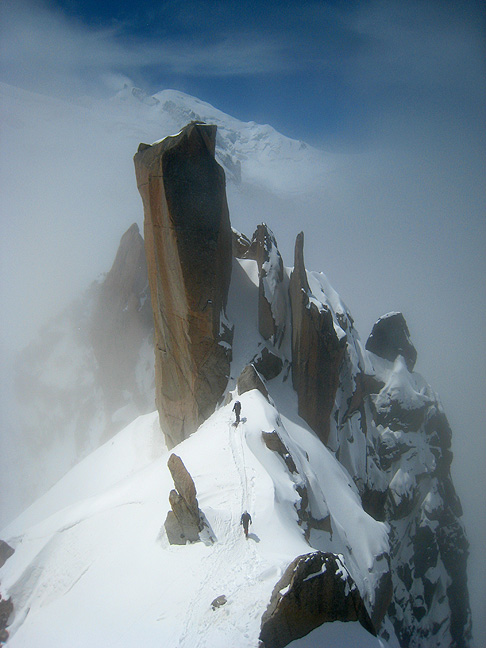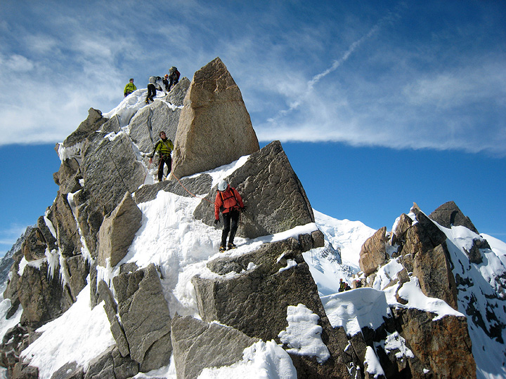 Other groups traversing around the first tower. Mont Blanc was wonderfully clear in the background. |