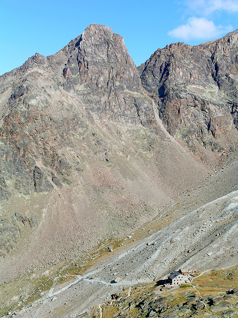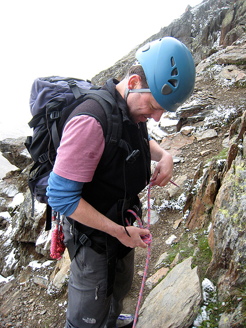 While visiting relatives in Sion, Hugo found the closeness of the Alps too attractive. So he scheduled a one-day climb with Mark. The original plan was to climb the Dent du Tsaillon, a rock route on a peak just above the village of Arolla. But recent snowfall (all the way down into Arolla!) made that option not so feasible. Looking for something not quite so high and south-facing, we settled on the Jegihorn, above Saas-Grund. |