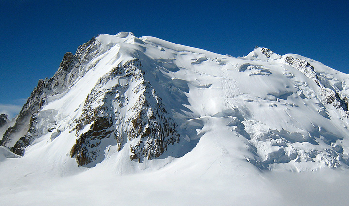 This photo, taken about 2 weeks earlier, shows the north side of Mont Blanc du Tacul. Mouse over to see the up, and down routes. |
