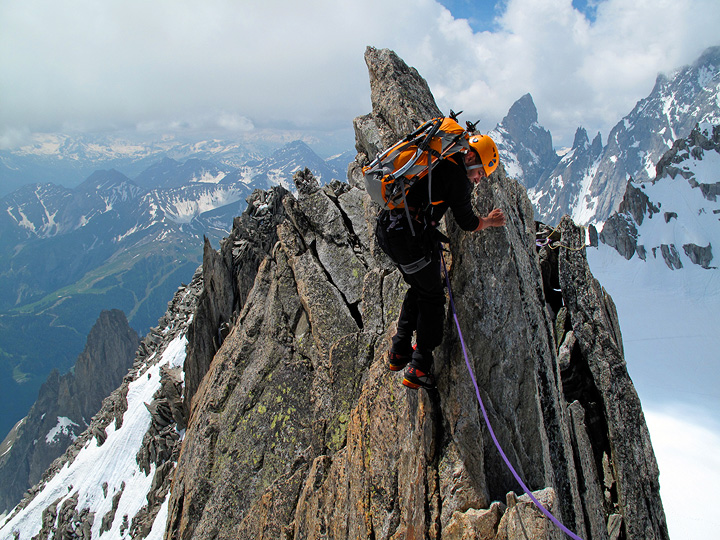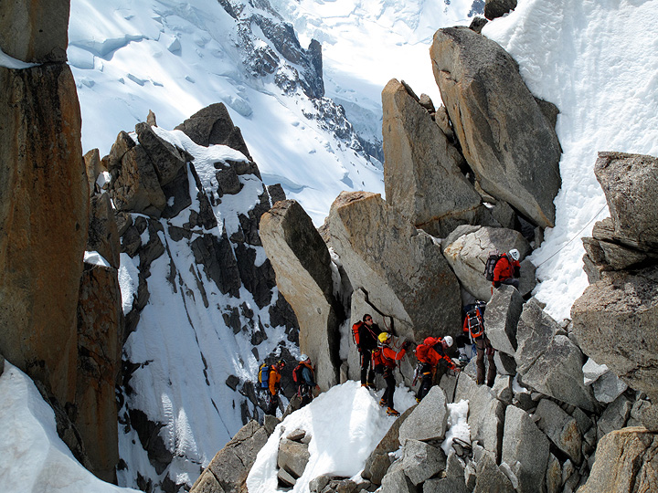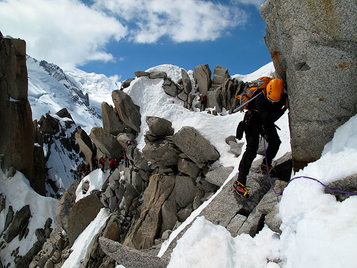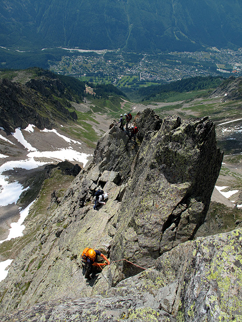 We began with an ascent of the Aiguille de l'Index. The SE Ridge offered a fine introduction to the exposure (and unfortunately the occasional crowds) of climbing in Chamonix. |