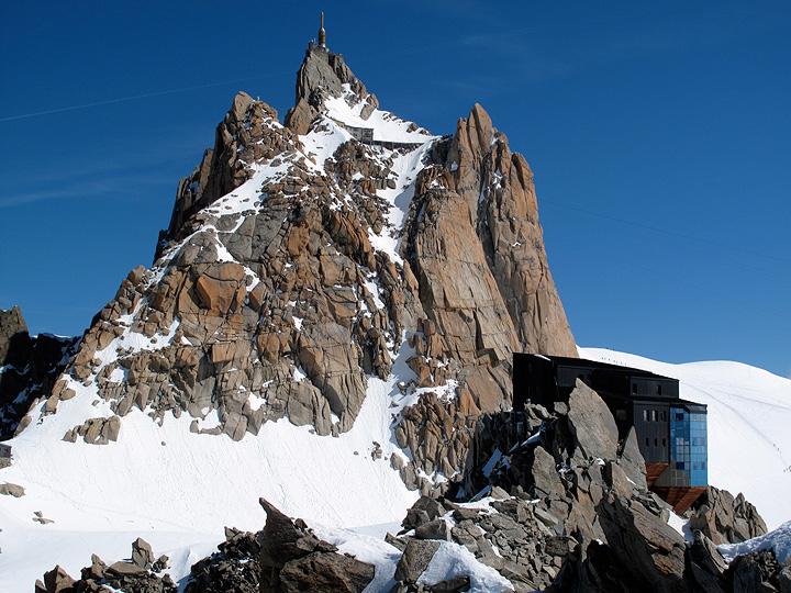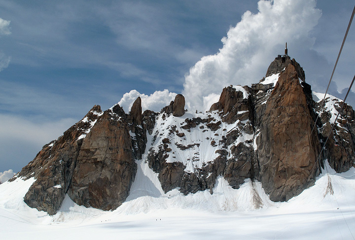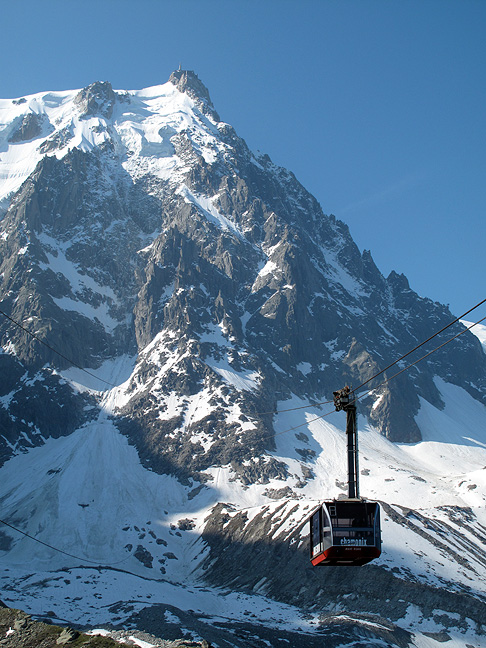 This is another view of the Aiguille du Midi, taken from the Panoramique cable car. The Arete des Cosmiques follows the left skyline. Again, roll your mouse over to see the route. |