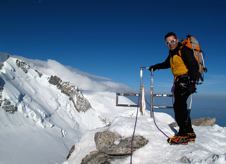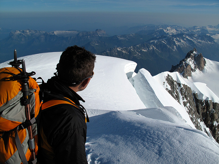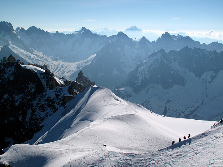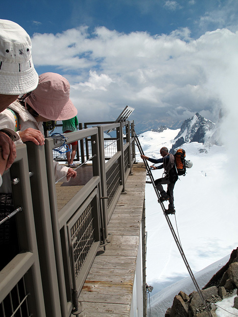 The next day, we took the cable-car up the Aiguille du Midi, an amazing "climb" in and of itself. Our plan was to climb the Arete des Cosmiques and return to Chamonix that afternoon. |