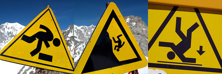The following day, we were back in the mountains. This time for the Traverse of the Aiguille d'Entrèves, on the Franco-Italian border. We rode the Aiguille du Midi Cable car again, and continued across to Point Helbronner on the Panoramique lift. We found an interesting assortment of warning signs. Mountains are dangerous! |