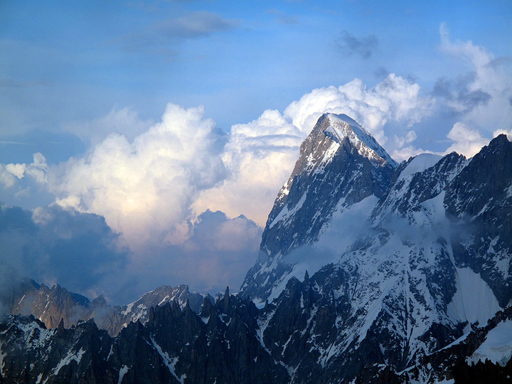 Sunrise on summit day. A lenticular cloud forms over the Grandes Jorasses. |