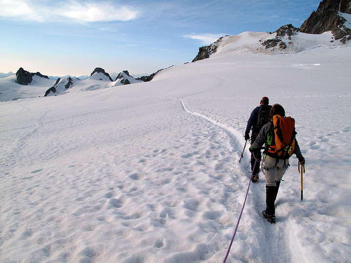 Heading down the normal route of the Weissmies. The big peaks of the Mischabel Group behind, the Alphubel, Täschhorn and Dom. |