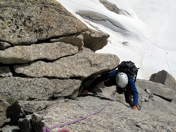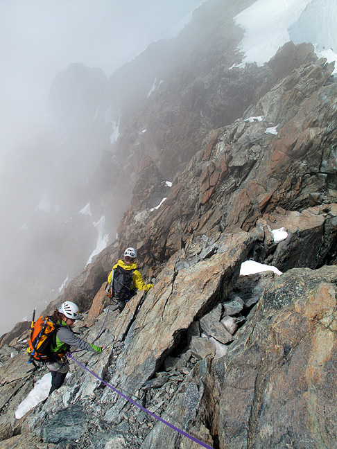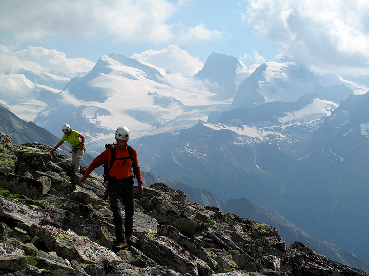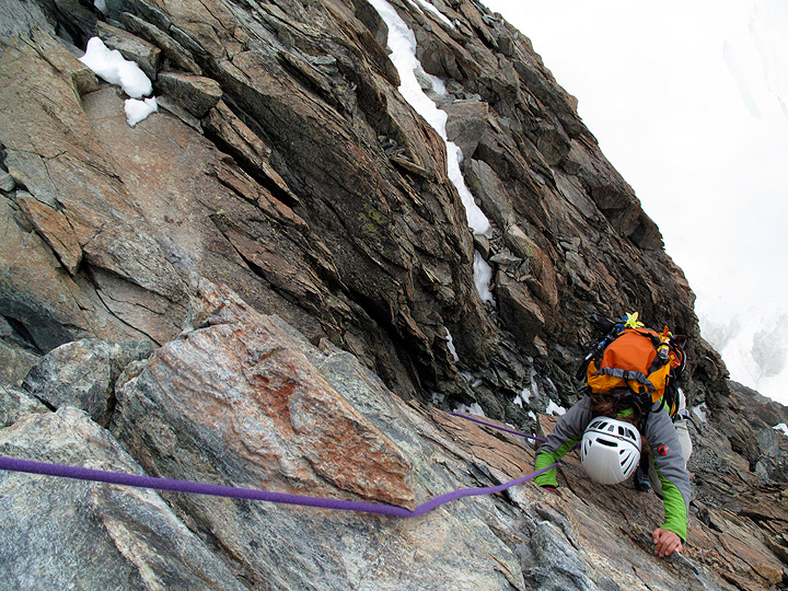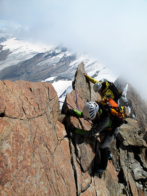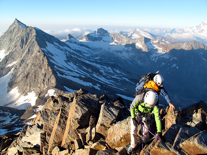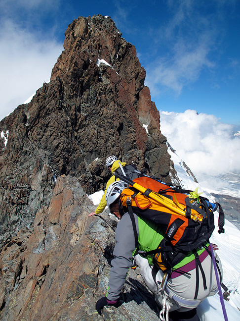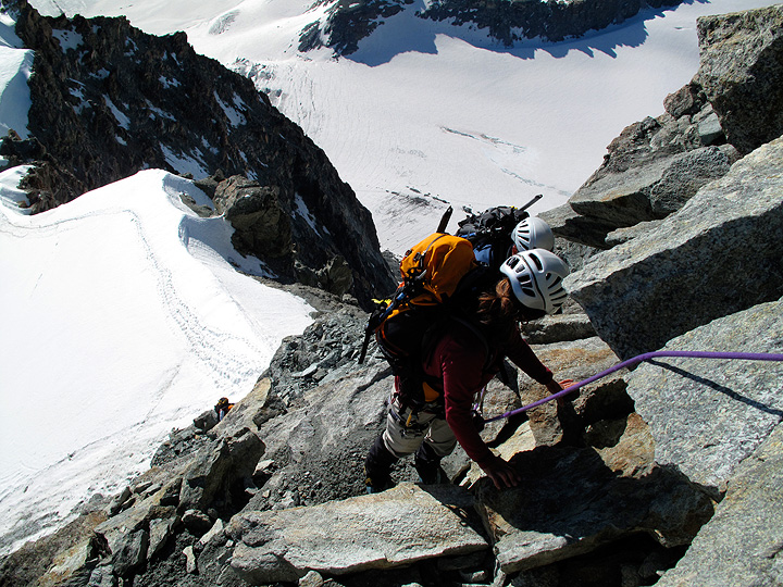 Climbing on the fun, blocky ridge of the Weissmies. |