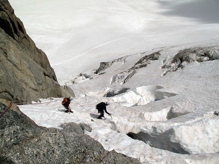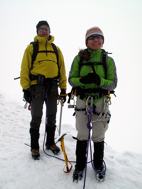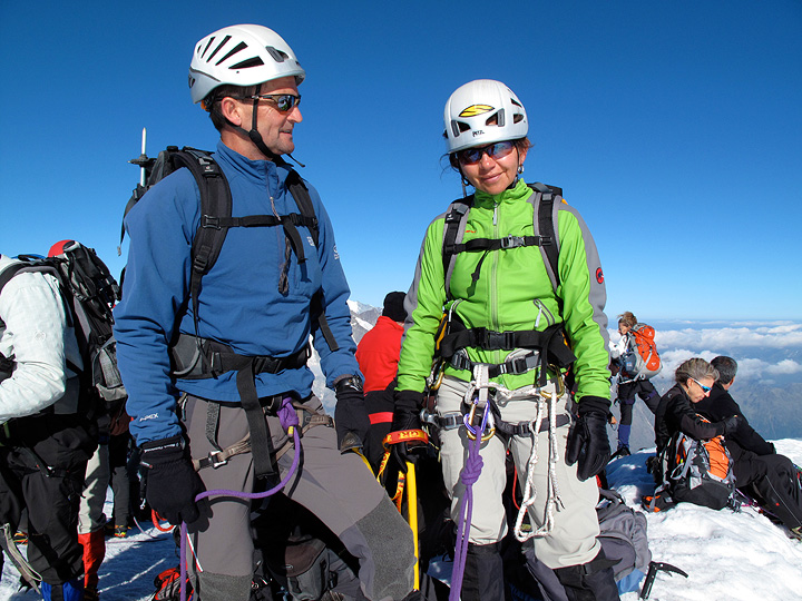 Rob and Consuelo, from Calgary, decided to spend their summer vacation in Europe, visiting friends, Paris, and even doing a bit of alpine climbing. They spent 10 days with Mark wandering between the alpine centers of Chamonix, Saas Fee and Zermatt. We enjoyed generally very good weather, quite hot, but with occasional afternoon thunderstorms. But by adjusting objectives to avoid the worst of the weather, we were able to climb every day, except for one used for a rather rainy approach to the Britannia hut. |