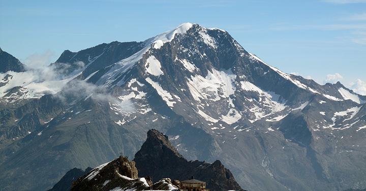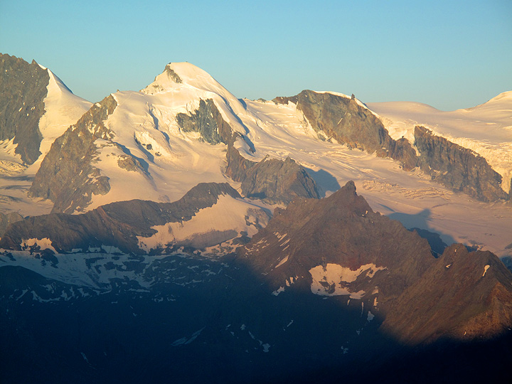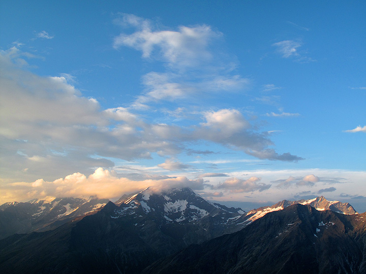 The evening sun from the Britannia hut. The Weissmies is the big peak in the center of the photo. |