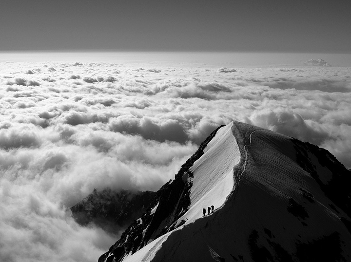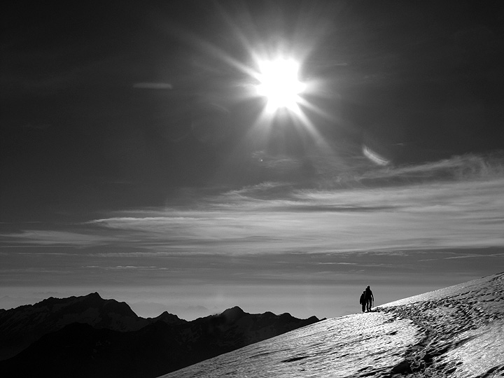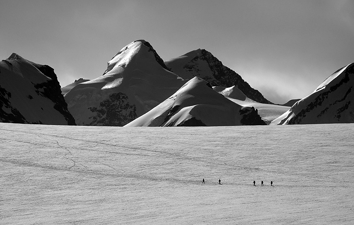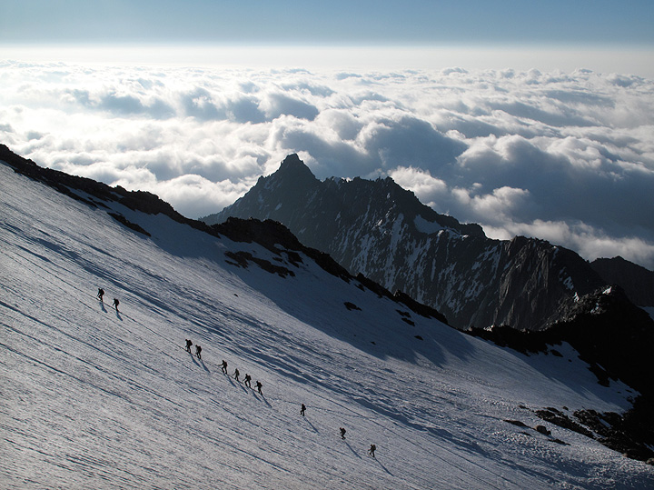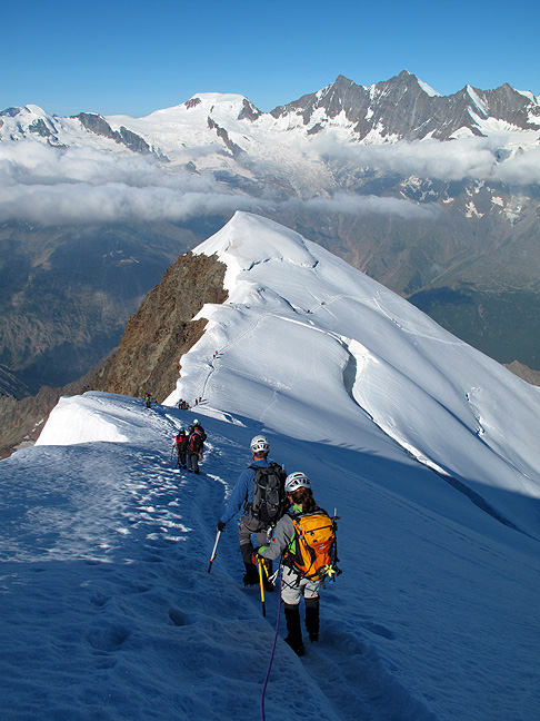 And on day ten, we traversed the Weissmies. Here a group of climbers takes the snow slope east of the ridge. |