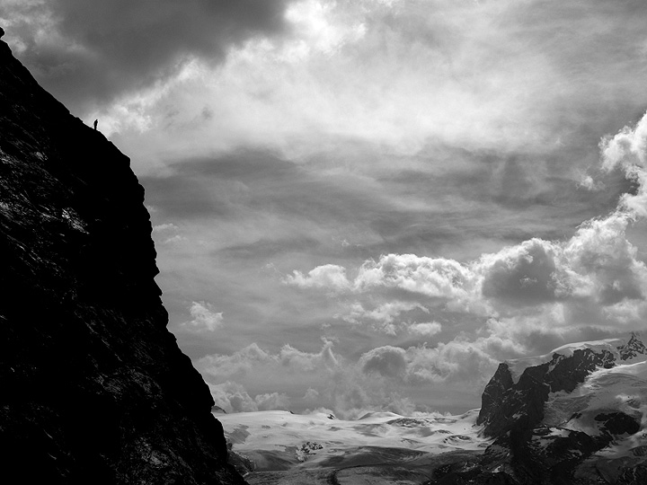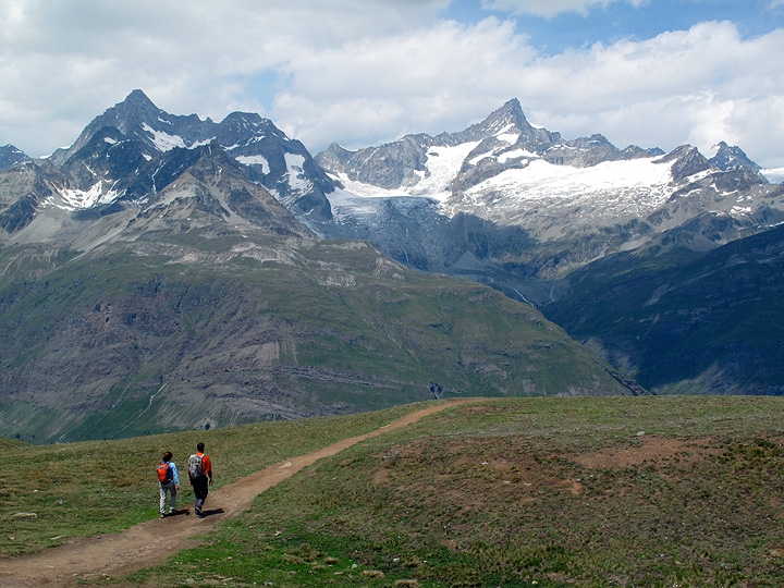 And the day finishes with a very nice hike down to Riffelberg. Behind is the Obergabelhorn on the left and the Zinal Rothorn on the right. |