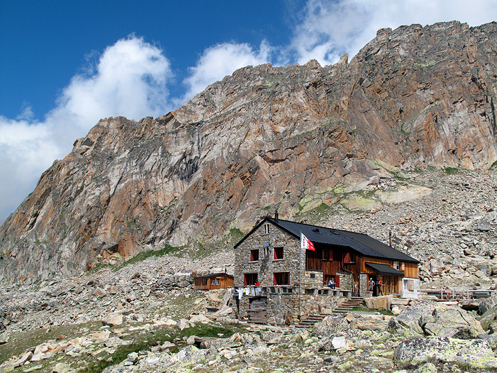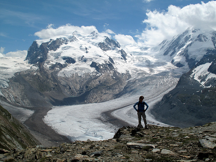 Easy scrambling leads back down to the hut. We made it with plenty of time to spare before dinner. The Strahlhorn, the Rimpfischhorn and the Allalinhorn are the big peaks behind. |