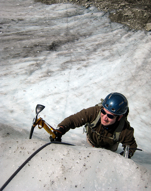 We started with some cramponning and playing around on the Mer de Glace. Matt tops out on a steep wall. |