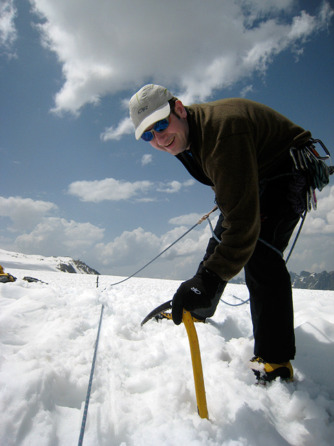 The next item on the agenda was some glacier travel and crevasse rescue practice, which we did on the Tour Glacier near the Albert Premier hut. Matt carefully approaches the edge of the "crevasse" that Kathy has "fallen" into! |