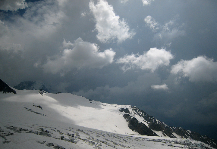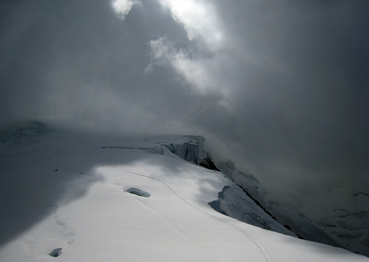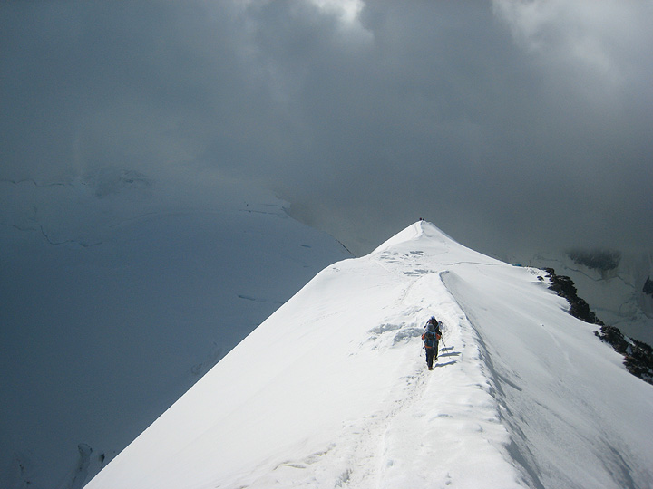 After hanging out in the Gouter hut for some time, waiting for the weather to improve enough to go on, we at last decided to give it a try. The winds on the ridge above were quite strong, and the visibility was not great, but it did feel good to get out in the exciting weather. |