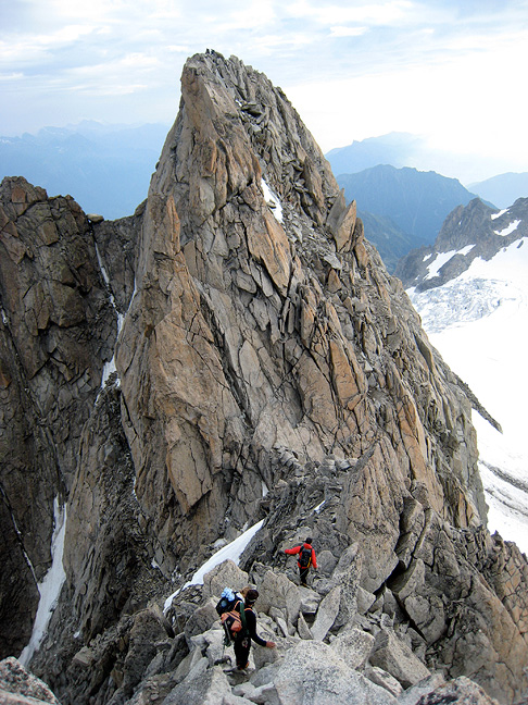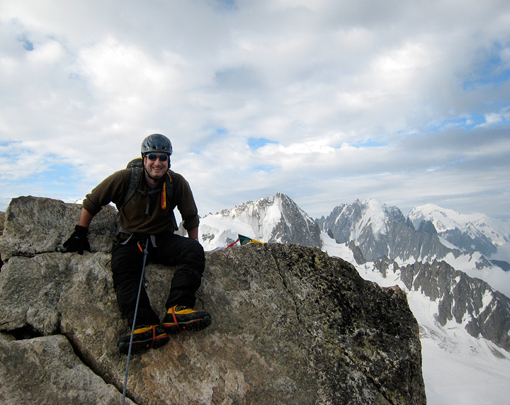 Matt takes his place on the tiny summit. In the background (left to right) the Chardonnet, the Aiguille Verte, and finally Mont Blanc. |