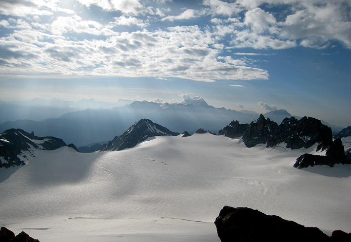 More views eastward into Switzerland from the summit. Although it's a bit too hazy to make them out, visible in the distance are the Grand Combin, and a whole bunch of the high peaks around Zermatt. |