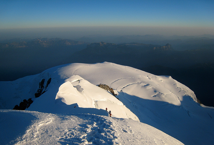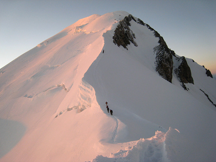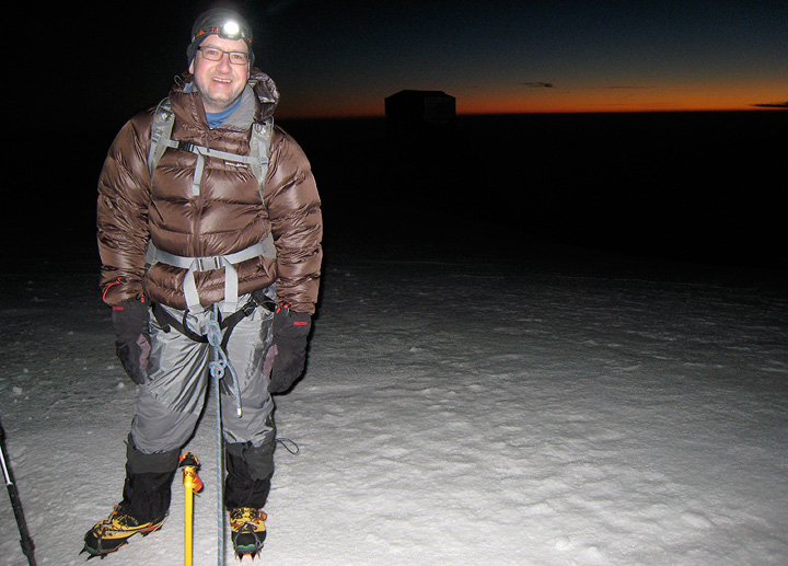 Which we were, as it turned out! The wind was still there, but much abated, and the skies were clear. Matt stops near the Vallot hut as the first gleam of dawn shows its color. |
