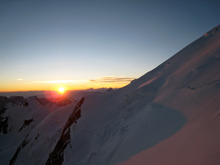 So now it's off to Mont Blanc. Our plan A was to sleep at the Tête Rousse hut, climb to the summit from there and on our descent, stop for the night at the Gouter hut, where we could sleep late (-ish) and finish descending at our leisure on our last morning. Here Matt pauses for breath on the steep rock buttress below the Gouter hut, as the first light of dawn begins to glow. |
