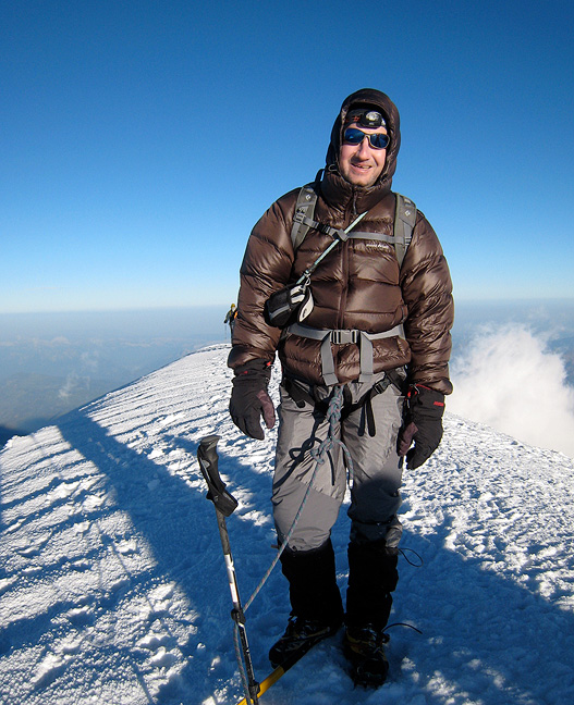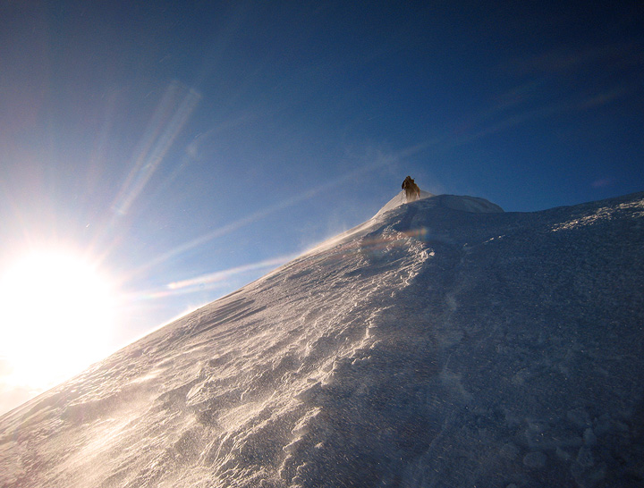 Though far from calm, the winds were low enough to allow us to climb the summit slopes and ridge without too much anxiety. Nearing the summit now.... |