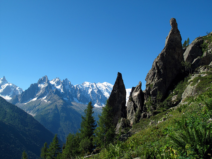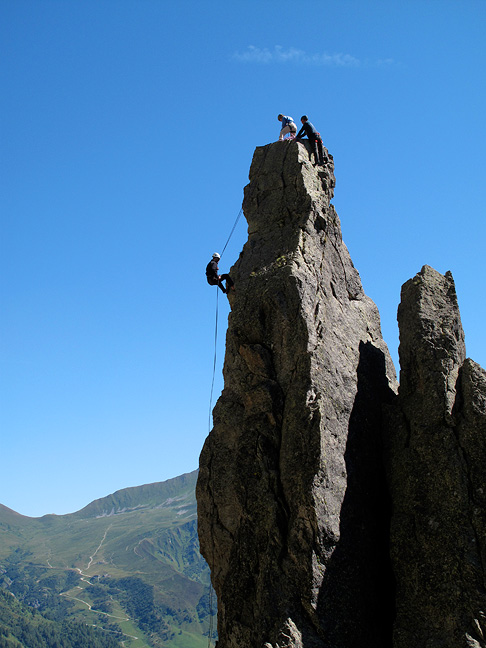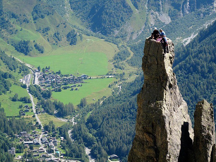 The Aiguillette seems to tower above the village of Le Tour. Kathy, Wim and Ive prepare their descent from the tiny summit. |