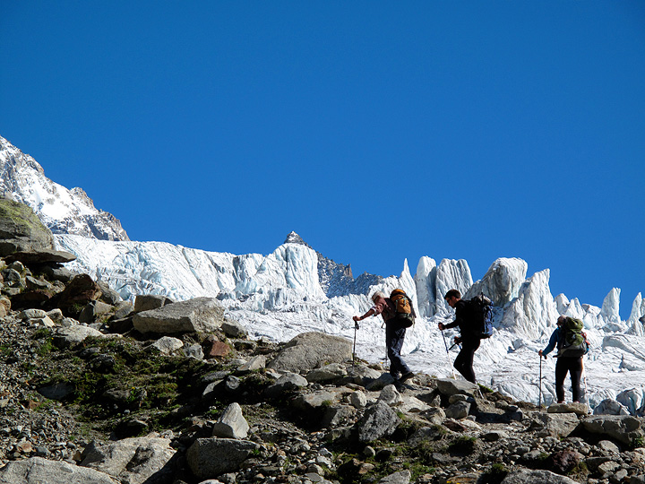 The last bit of steep moraine up to the hut could be tedious but for the nearby views of ice towers on the glacier. |