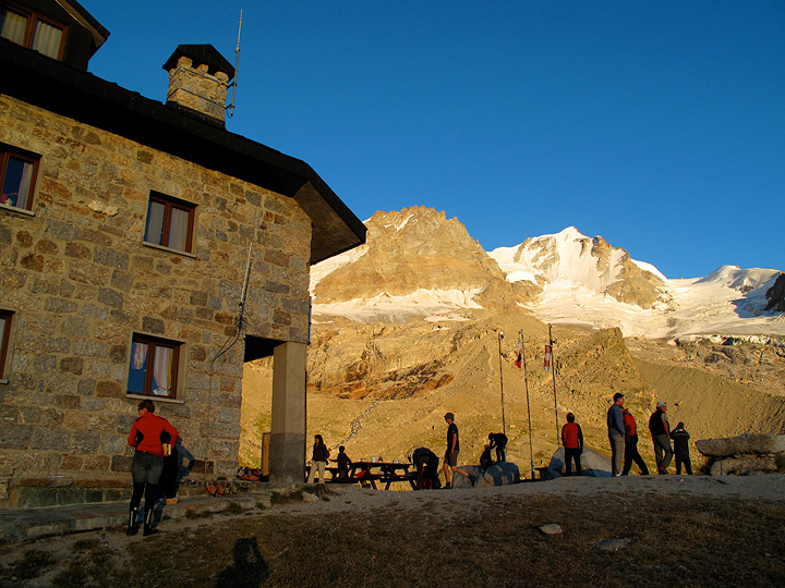 The Chabod hut just before dinner time as the sun sets. |