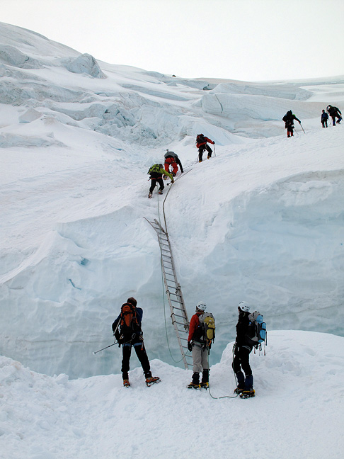 A large crevasse yawns bridge-less across most of the face, cutting off passage entirely, were it not for this ladder placed by accommodating local guides. |