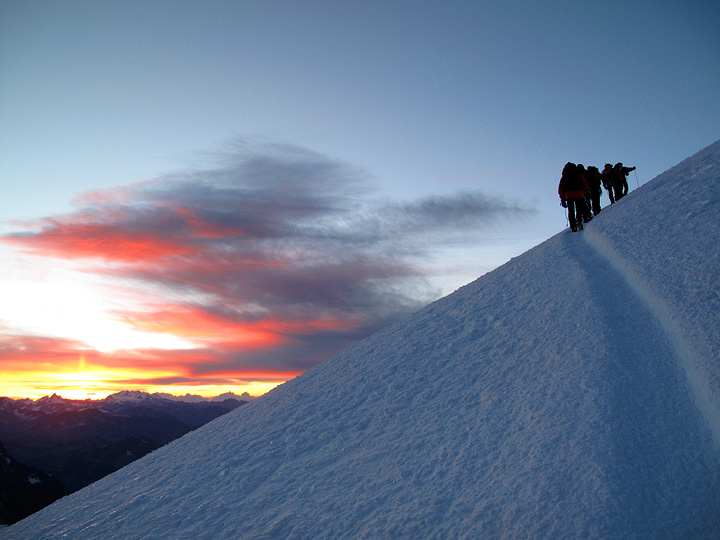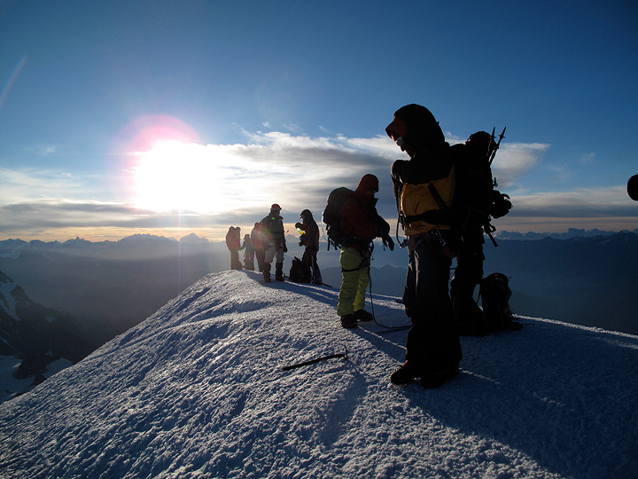 Up at one in the morning for a quick breakfast. We made good time, and had little crowding on the often problematic shoulder of Mont Maudit. Sunrise occurred as we are part way up the final dome of Mont Blanc. |