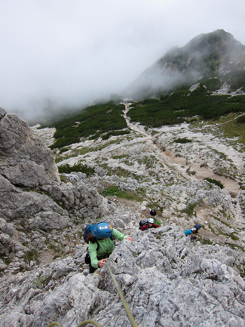 The forecast wasn't brilliant for the week, but our first day stayed dry for our climb of the South Rib of Hexenstein. Sandy follows the first pitch, while Gini leads the second rope team as mists roll in below. |