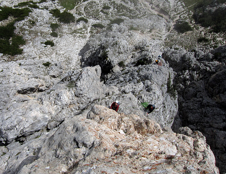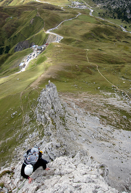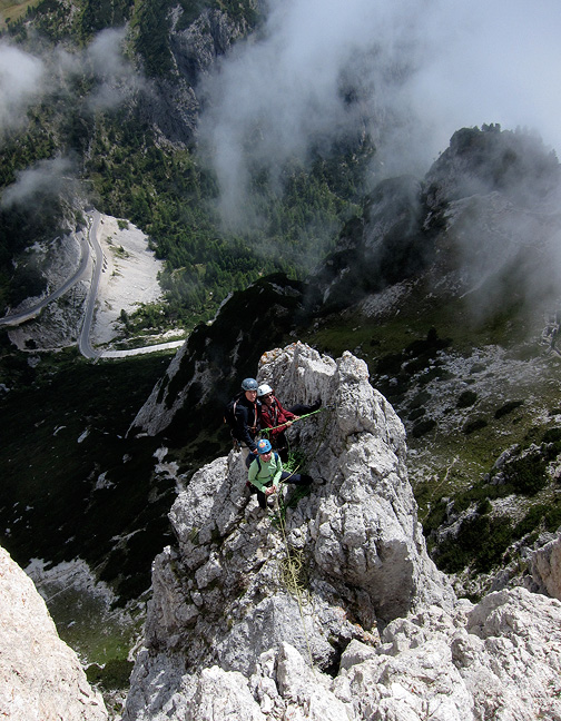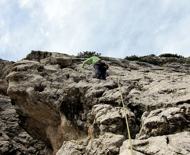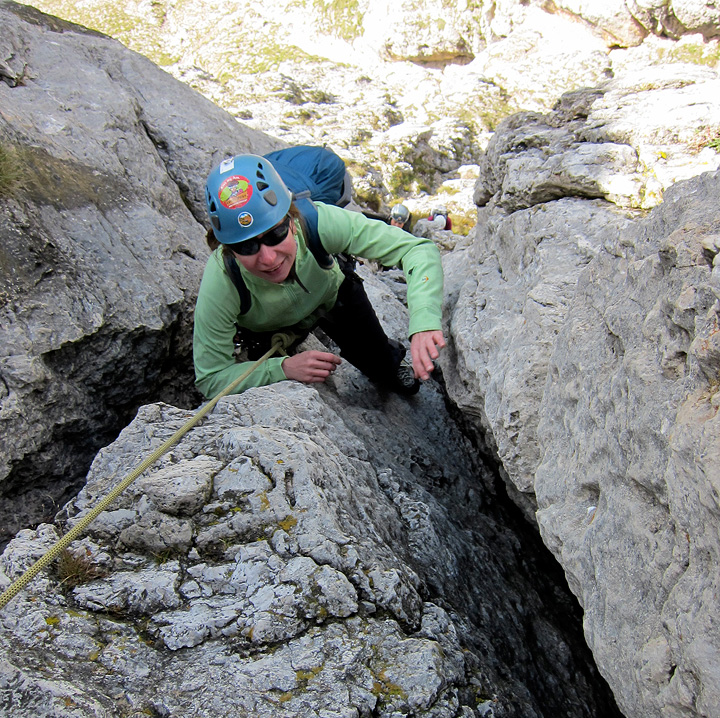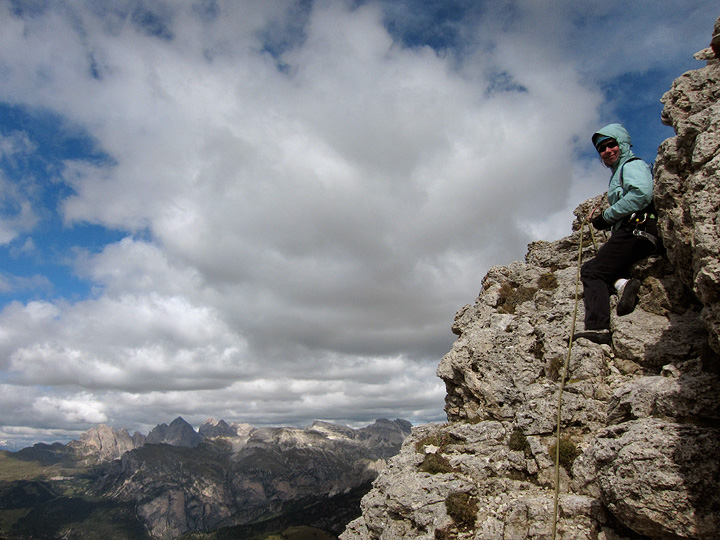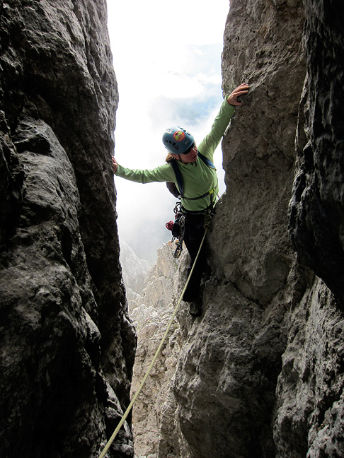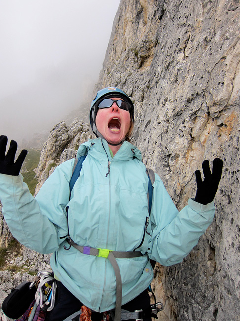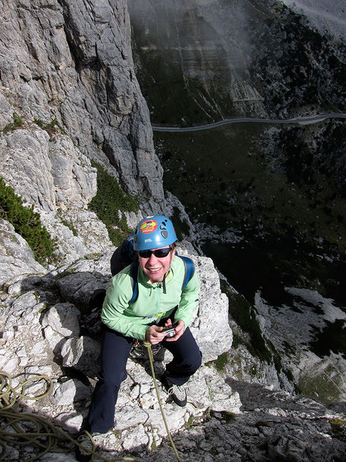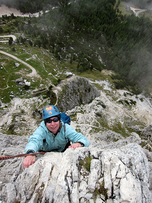 There was not much improvement on our third day, but at least it was dry as we started up the Torre Piccolo di Falzarego. Sandy is bundled up here as she tops out on the first long pitch. |