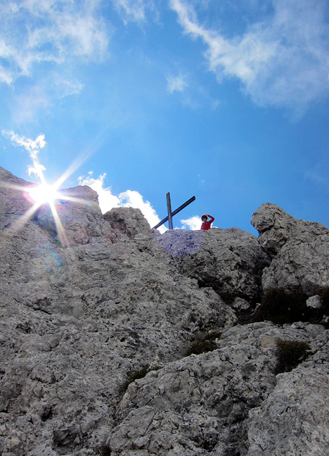 Looking up the last moves to the summit, where a hiker has spied us below. |