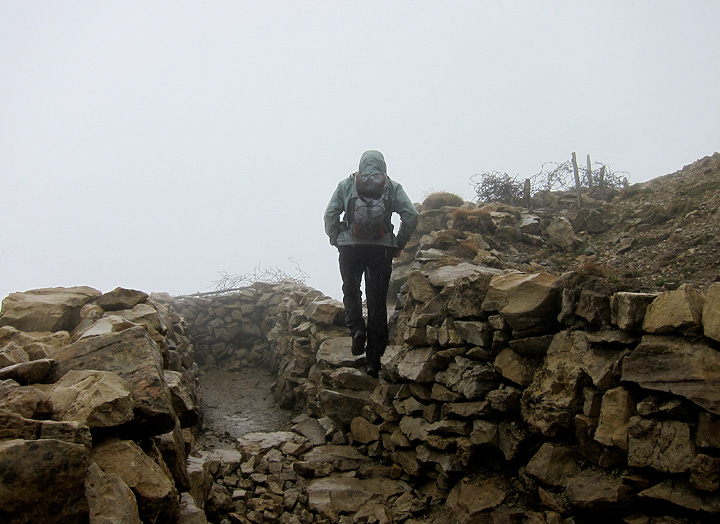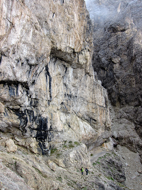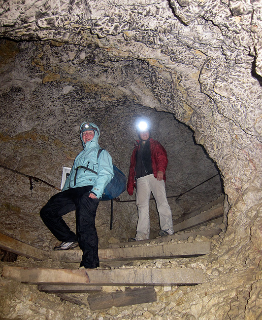 Then we braved the freezing sleet to descend via the historic Galleria del Piccolo Lagazuoi, where Italian and Austrian troops waged repeated battles during the first world war, struggling for control of a huge system of tunnels blasted into the walls of this peak. Gini hurries by tangles of barbed wire in the wet and chilly wind. |