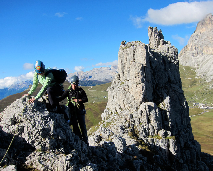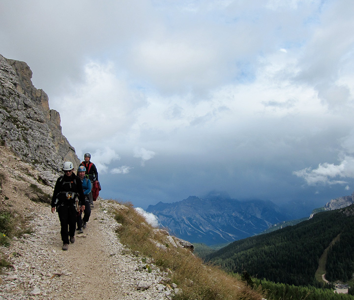 Though still very cold, the sun at least came back for our last day of climbing together, at the Sella Pass. Here we approach the base of the Steger route on the First Sella Tower. |