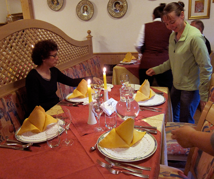 One of the many pleasures of rock climbing in the Dolomites, you can be screaming in a cold rain in the afternoon, but sit down to a terrific dinner in your cozy hotel a couple of hours later. |