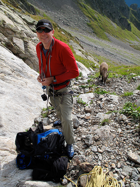 No, this is not Mark, but just a friendly and curious ibex. We are at the roping-up point for the start of the our climb on our first day, the Chapelle de la Gliere. |