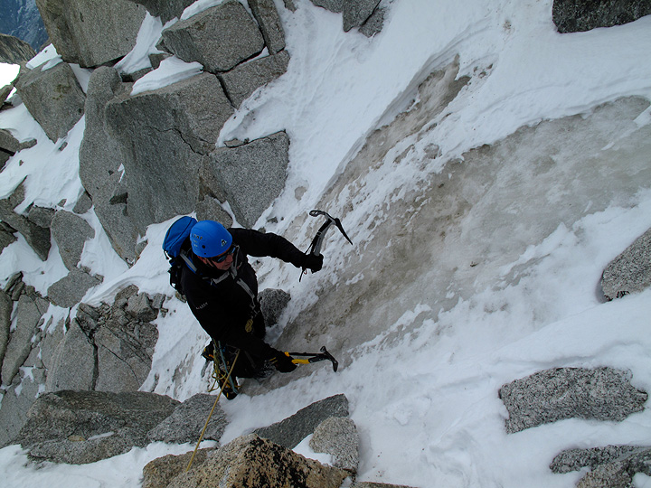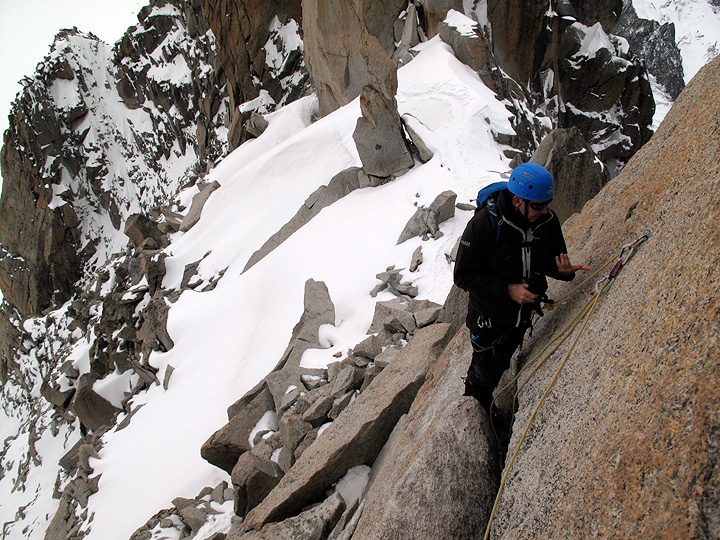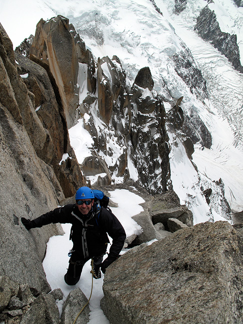 Making quick work of the Pointes Lachenal, we decided to return to the Aiguille du Midi via the classic Arete des Cosmiques. Here, Mark contemplates his next move on the crux of the route. |