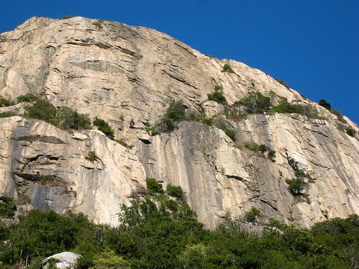 This is an alternate start to the Chapelle. We climbed 3 pitches, up to about 5c, to gain the Chapelle route at the top of its 2nd pitch. |
