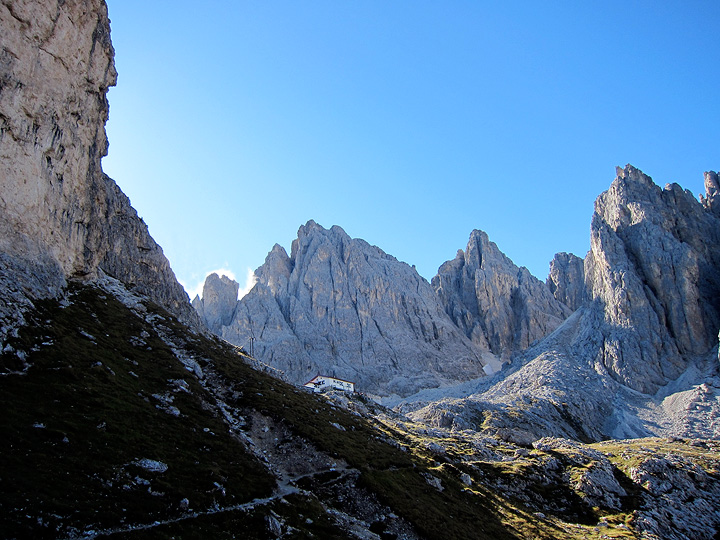 Our first day dawning cold but clear, we headed up to a steep little needle called "Il Gobbo", nearby the Fondo Savio hut shown here. |