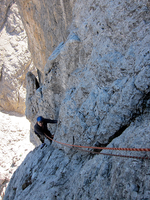 The route actually starts on Torre Diavolo (left), and crosses to Il Gobbo (right) just about at the point from which this photo was shot, looking up at another party descending the Diavolo. |