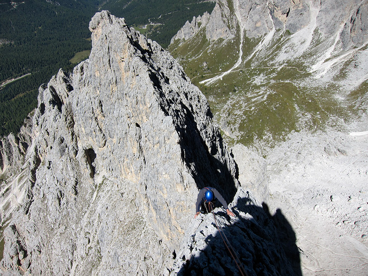 The route ends on an airy ridge crest, with spectacular exposure and views. |