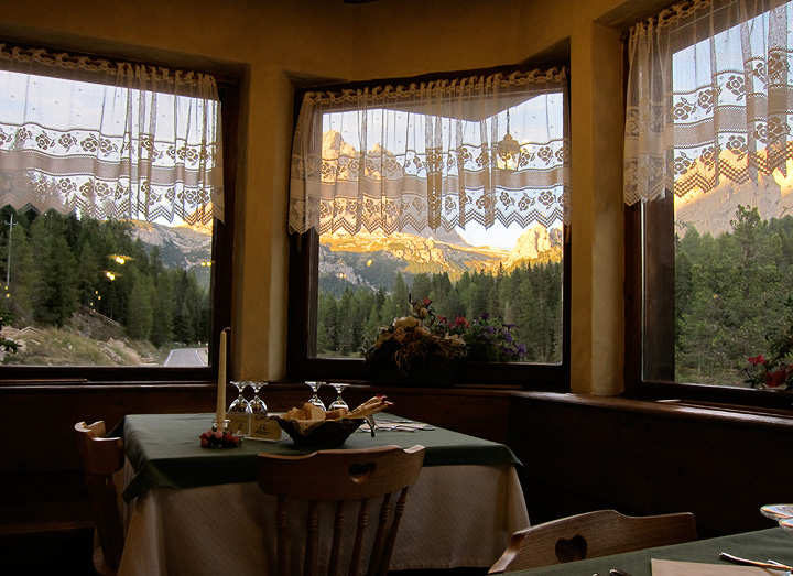 Our table is set, in our comfy, homey and very conveniently located hotel, the Albergo Lago Antorno. The Tre Cime are visible through the dining room window. |