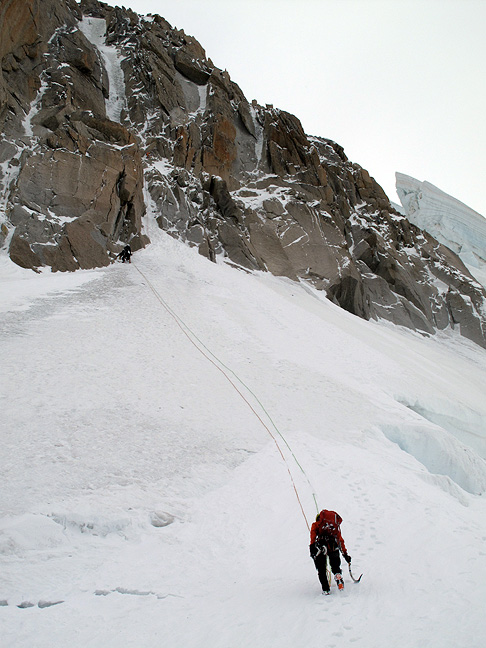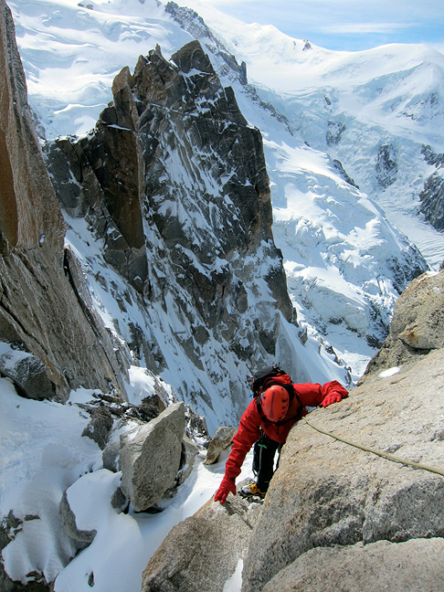 Joe moves smoothly up the steep wall of the hardest moves. Believe it or not, crampons make this section somewhat easier than bare boots. |