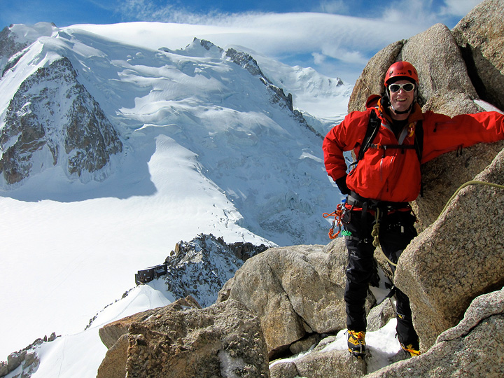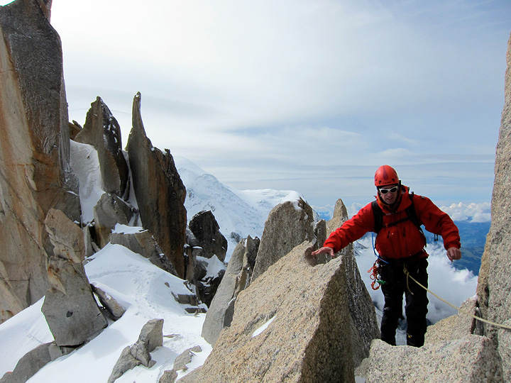 For Joe's first day, and an introduction to climbing in the French Alps, Joe and Kathy climbed the Arete des Cosmiques. Recent snowfall frosted the route and required crampons the entire way. Though they had reasonable weather (wind was the only serious issue) the lenticular clouds over Mont Blanc behind heralded the arrival of another storm that night. |