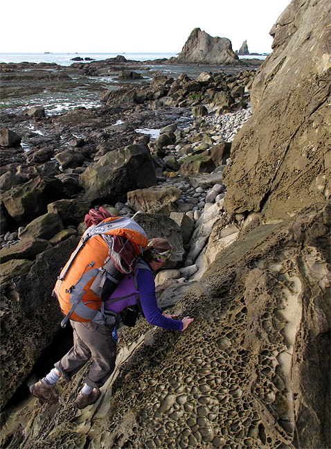 Knowing we would have some tidal issues the following day as well, we thought we should try to get as far along as we possibly could on this day. We set Yellow Banks as our goal. Unfortunately, a couple miles to the south, the sand becomes a very long section of boulders and bedrock, very slippery in the slimy seaweed. The low winter sun lacked the power to dry much of anything off. Progress slowed to a crawl. |