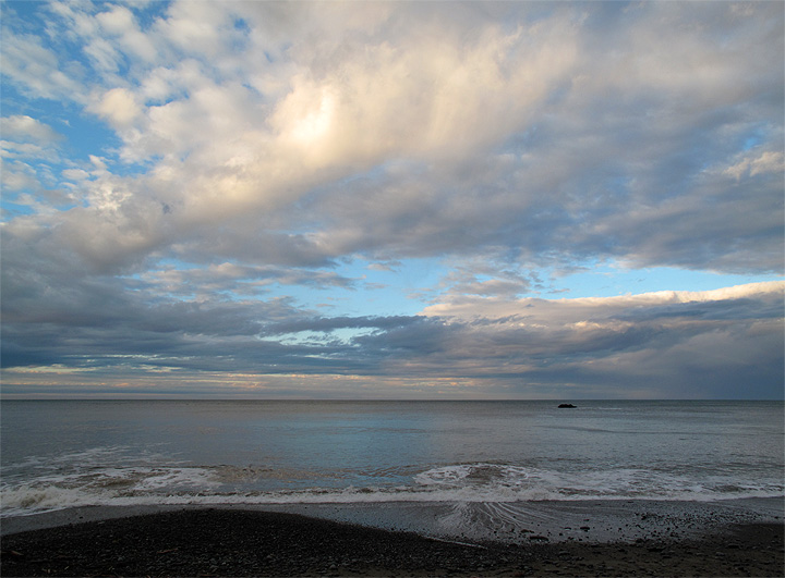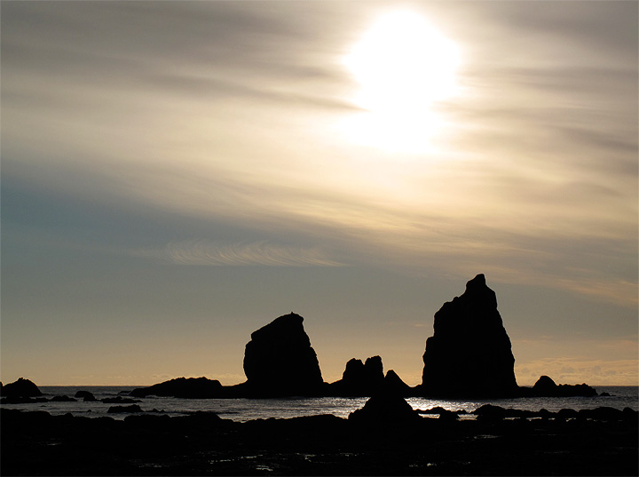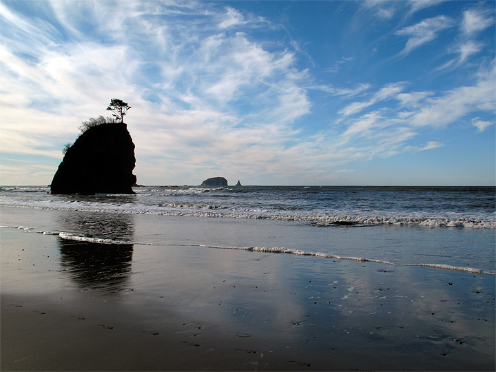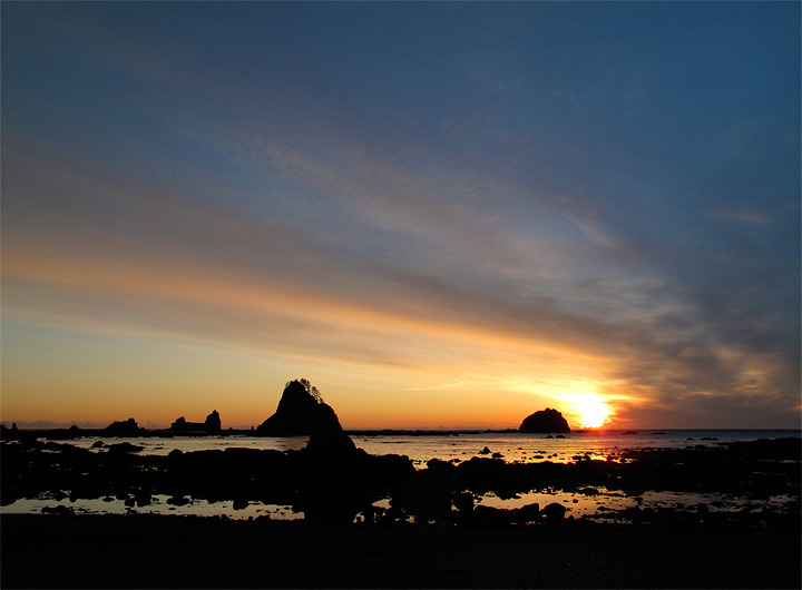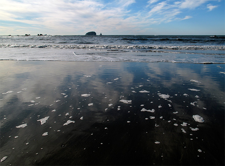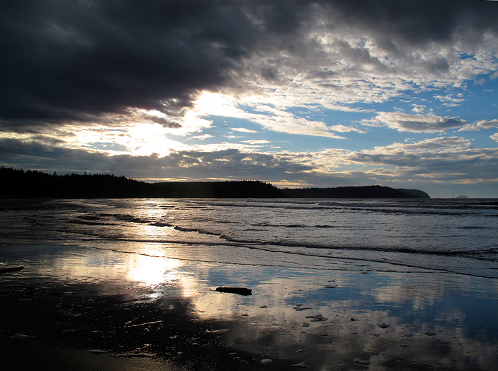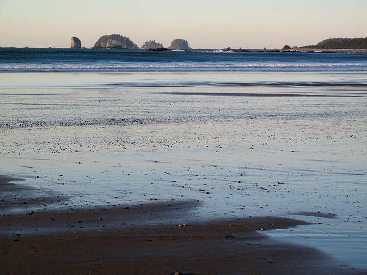 Just before sundown we reached the beach at the Chilean Memorial. The half-day's walk from Rialto Beach had been wonderful. The tide heading out, and out, and out, mostly clear skies and hardly a breath of wind. |