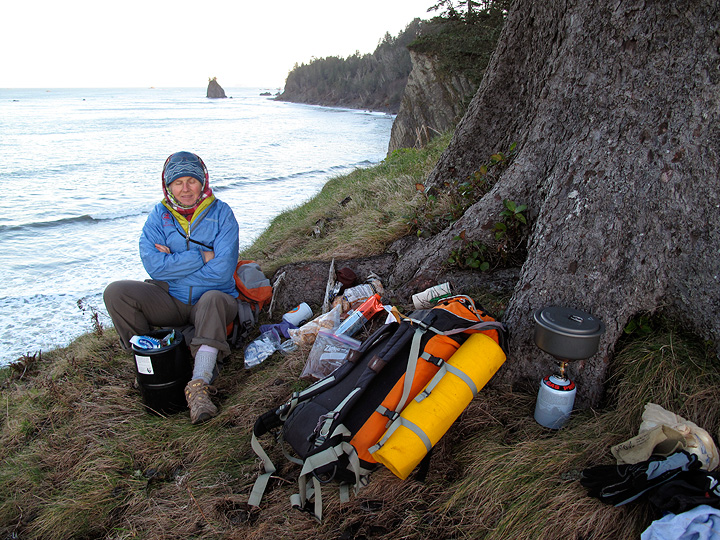 After setting up our tiny tent and preparing bed, Kathy worked on dinner while Mark struggled to find a scrap of wood that was not completely saturated with water. In the end he failed. But he did find all manner of flammable flotsam and jetsam. Some solid petroleum products apparently burn much better than others. We learned that styrofoam not only stinks, but is hard to light. It will, however, keep a good fire going. Polypropylene rope is pretty much useless as fire starter. The best fire starter turned out to be those PET drink bottles that are so unhelpful to the environment. Get out your Swiss Army Knife (we lacked anything bigger) slice up a bottle or two into strips and lay them in with your wet kindling. Once you get a flame going, the melting plastic oozes down into the wood and is more than enough to eventually get the wood dried out. Continue with bigger pieces of wood, throw in another bottle or two, a hunk of styrofoam, or perhaps a Barbie Doll (untimely victim of a container lost at sea) and before long, real wood, even if soaking wet, is enough to keep things going. Actually, all this "fire starter" was one of the sadder facts of this hike. Though our memories may be faulty, we certainly did not recall the sheer volume of trash that has washed up on the coast. Most of it appears to be related to the fishing industry–floats, tangled knots of rope and other buoyant boating odds and ends. I suppose it will just get worse and worse, as this stuff is amazingly resistant to even the pounding force of the ocean waves. |