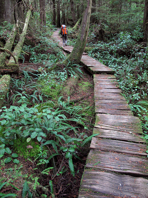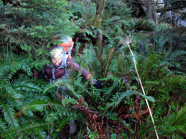 Even with as leisurely a breakfast as we could manage (we couldn't go anywhere until the tide began to recede a bit) we simply decided we could not sit there all day. With the beach not an option, it was into the woods. Actually, the going was not all that bad. There were few plants with thorns, and in this neck of the woods, the undergrowth was mostly relatively friendly sword fern–much better than the nearly impenetrable over-the-head salal that is also found on the Pacific Coast. |
