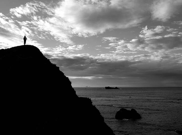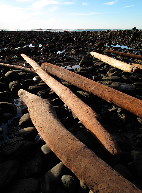 Back to the problem with the moon... Well, the tides were not really in our favor. On this walk, tides rule your life. There are some headlands that you can't pass at high tide, and even walking on the log-strewn beach at high tide was all but impossible. The timing of passing certain obstacles was not ours to decide. Here's a quick tidal explanation for all you land-lubbers. There are two high tides and two low tides each day. So the transition from a high tide to a low tide takes about 6 hours (more like 6 hours and 10 minutes, but who's counting?). Often, one of the daily high tides is much higher than the other. The same can sometimes be said for the low tides, with one much lower than the other. Well, on our hike, the highest high tide, was at about 11 in the morning, and the lowest low tide was at about 5 in the afternoon. Doing the math, you can see that the not-so-high high tide would occur at a not-very-useful 11 at night, and the also not-very-helpful not-so-low low tide occurred at about 5 in the morning. Congratulations if you have stayed with me so far. The upshot is that the only really good time for walking was about the 2 to 3 hours just before sunset. Not very convenient. |