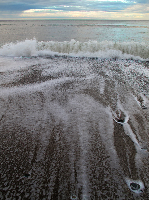 Eventually, the tide began to go out enough that we could move along the slippery driftwood, occasionally dashing out to run along the beach when a receding wave permitted. The good news was that the tide, while still rather high, was heading out. |