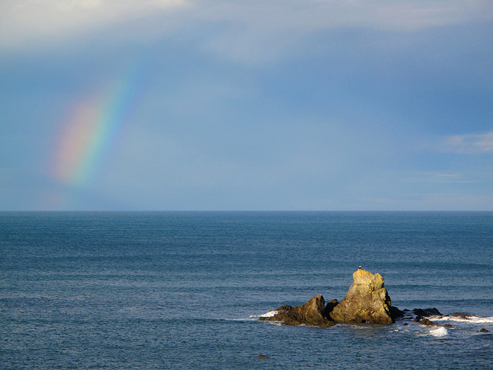 A small rain shower out over the ocean gives us a a bit of rainbow. And though it is hard to see, that's a bald eagle sitting on the rock. |